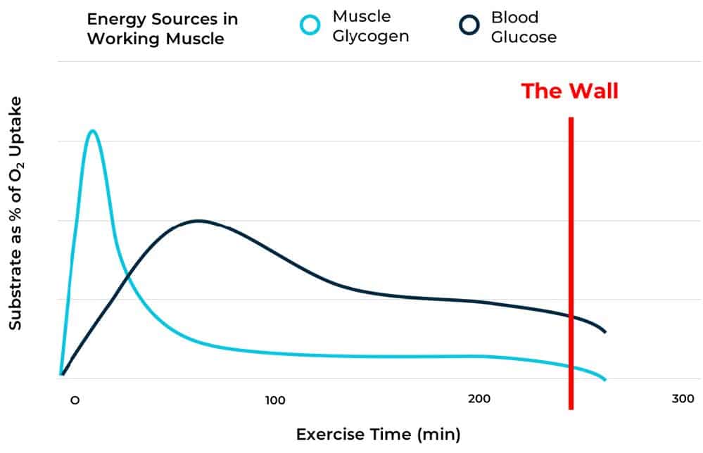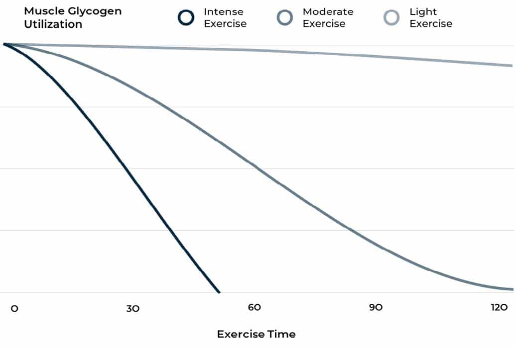 Figure 1[/caption] FIGURE 2 shows that muscle glycogen usually becomes functionally depleted in 60 minutes during heavy exercise and in 2 hours during moderate exercise meaning, your battery (i.e. access to fast release energy) runs out. After this point, to keep going, energy must come from burning blood sugar.