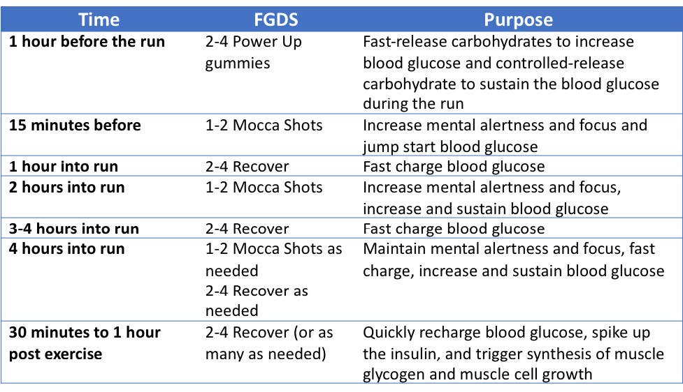 Recover gummies are designed to support the glycogen recharging process. Recover is packed with high GI sugars, which quickly spike blood glucose through mucosal absorption. Moreover, vitamin B and BCAAs are readily available with blood glucose to grease the machinery for the glycogen synthesis and muscle cell growth. The result is quicker and efficient glycogen synthesis, higher glycogen reserves.TABLE 1 is a recommend regime for a runner to take advantage of FGDS for better sports performance and faster muscle growth.